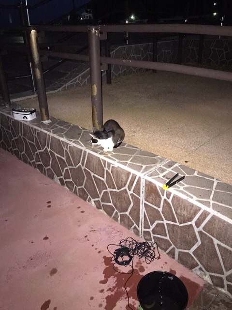 このネコにリズムを崩されたのか、その後はさっぱりで、完全に日が落ちてからは常夜灯に集まってきた豆アジを何匹か釣って試合終了。