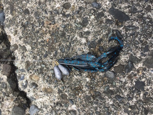 まずは手前の海藻エリアに金玉リグをぶち込む。