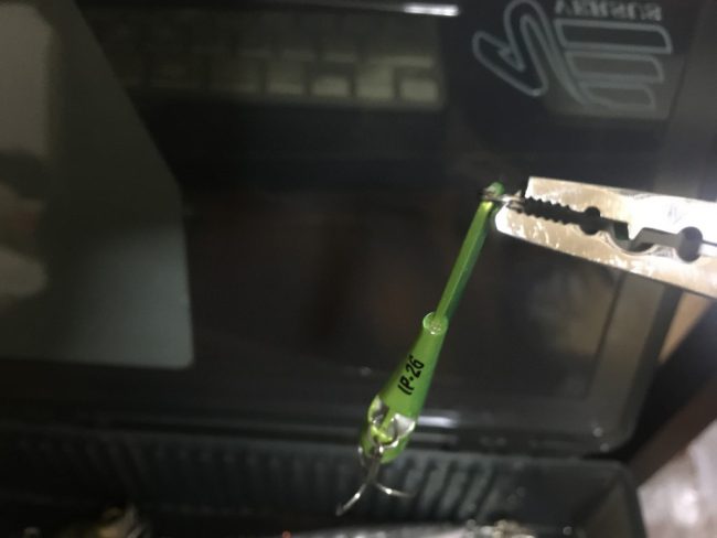鉄板バイブみたいにフックアイがちょっとルアーのボディに引っ込んでるタイプだと、ちょっと開きにくいけど、ちゃんとフックを交換することができました。