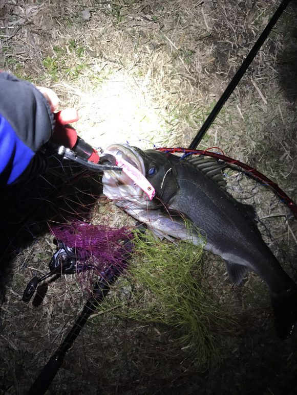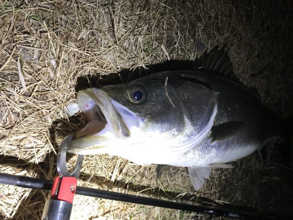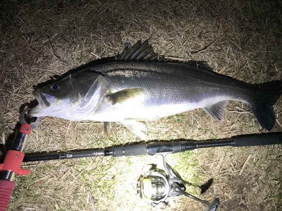 前日冷たい雨が降ったのでどうかなと思ったんですが、今シーズン初のスズキサイズのシーバスが釣れました。