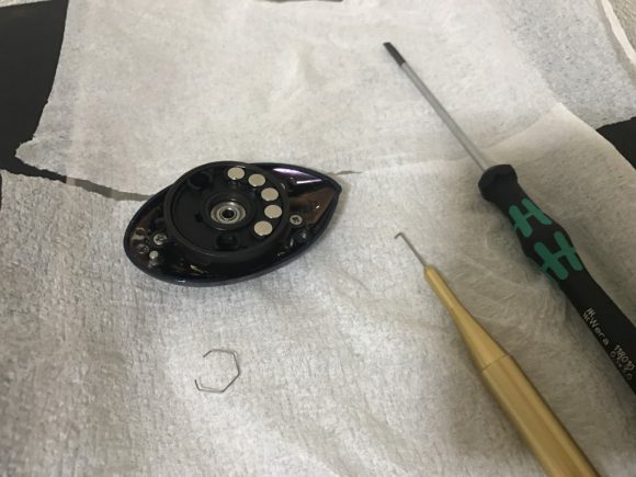 ベアリングの上にクリップみたいな細い金属がはめ込まれているのが分かるでしょうか。まず最初にこいつを取り出します。