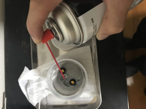 人によってはケース毎シャカシャカ振って洗浄する人もいるみたいだけど、ベアリングが傷つく可能性があるので、エアダスターでぶくぶくする。