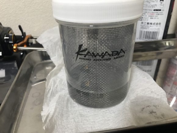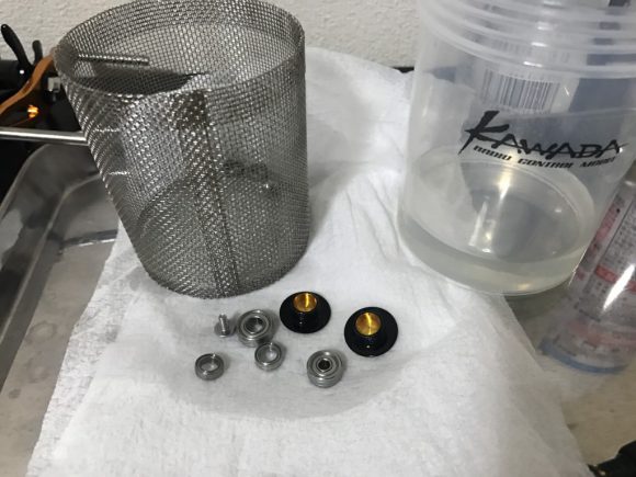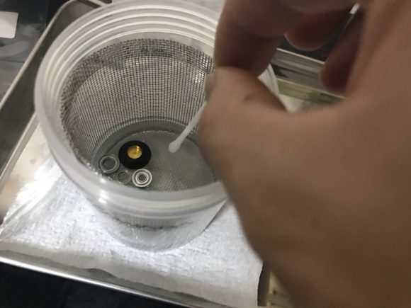 ベアリング以外のパーツを取り出して、ベアリングだけさらに浸け込む。10分くらい放置。