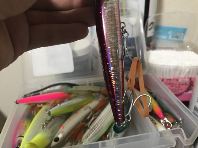 こんな感じでルアーを縦にして、リアフックに輪ゴムを引っ掛けます。