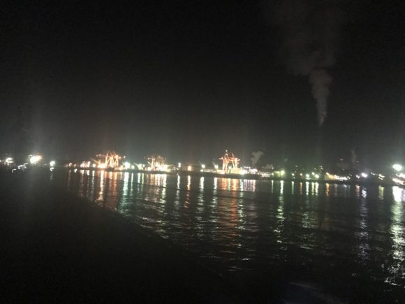 エサ釣り師が数人竿を出していました。夜は対岸の工場群が煌々と。
