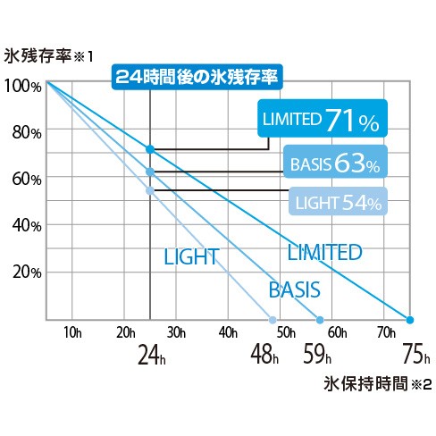 I-CE1hにつき1時間氷を保持できることを指し、たとえばI-CE60hという表記なら容量の20%の氷を60時間キープできる保冷力がある目安となります。