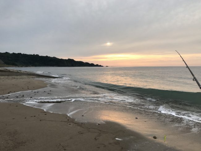手前までルアーが来たところでガーッと巻いて回収してたら、(たぶん)退いてく波の抵抗で一瞬重くなってすぐにそのテンションは開放された。