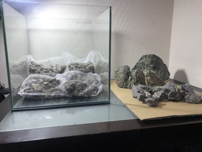 水を入れる段階になったら、シダ系や、クリプトコリネの仲間、ハイグロフィラなど活着系の水草を入れる予定です。