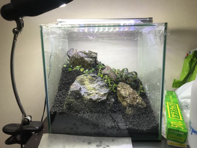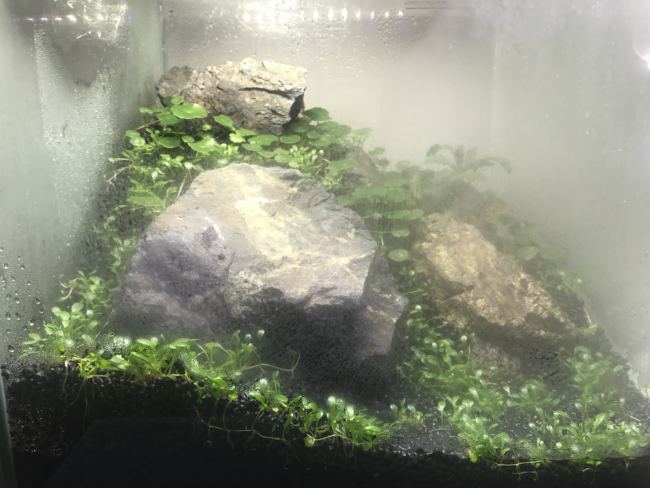 ミスト式で水草も成長してきて、いよいよ水入れ間近となりました。