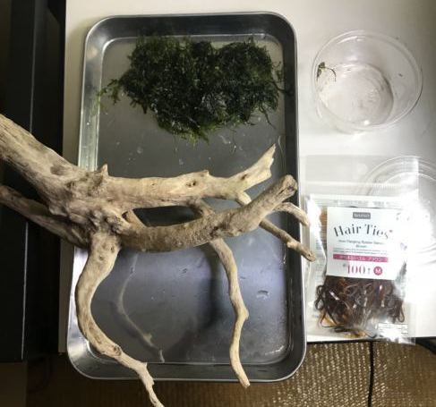 流木は角度が決まったら一回取り出して、ウィローモスとミクロソリウムナローリーフを巻きつける作業へ。