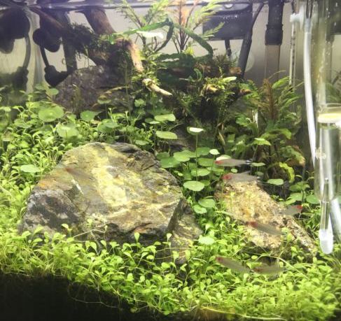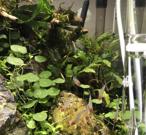 輸送中に1匹、導入後に数匹と数が減ってしまいましたが、現在はラミノーズが7匹、エビが5匹の生存を確認しております。