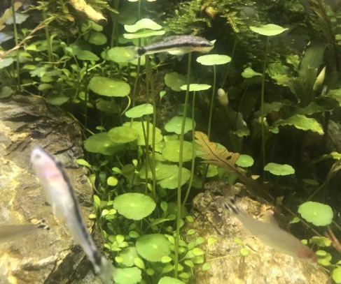 ラミノーズはいつも群れてます。最近エサが水面から投入されていることを学習したみたいで、浮いてるエサを食うようになってきました。