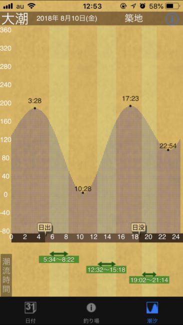 18時ごろの満潮から23時の干潮にかけての、夜の時間帯に大きく潮が動いているのがわかります。
