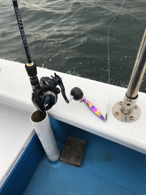 船がスピードを落とし魚の反応を探し始めて、ワクワクしながらジグをセットする。