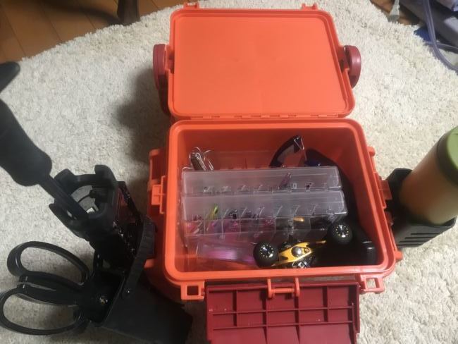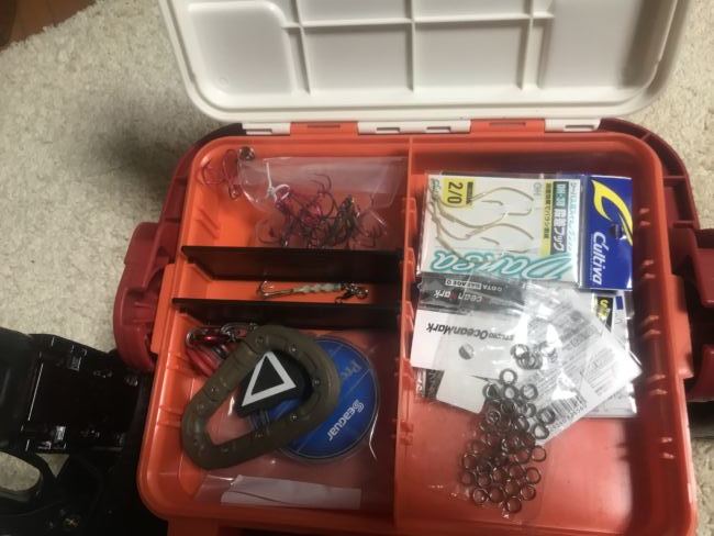 写真撮った時はタチウオ船に乗る前だったのでジグを入れてますが、タックルケース3個は余裕で入るので、ルアーを使う釣りにも対応できます。